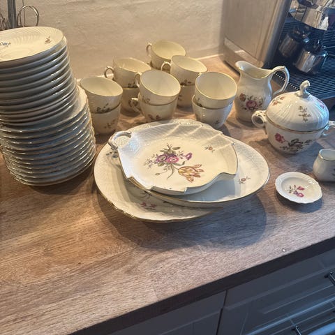 Royal Copenhagen stel i porcelæn med blomstermotivet “Hjertegræs” Sættet består af forskellige kagetallerkener, kopper, skåle, sovseskål og fade i hvidt porcelæn med grøn kant og dekorative blomster. Velegnet til daglig brug og servering. Sælges helst samlet, men enkeltdele vil også være muligt
