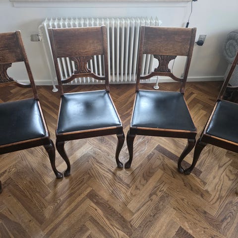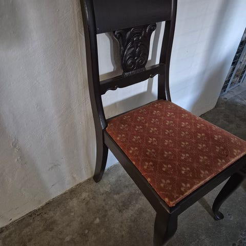 14 stole i træ med polstring. Evt. DIY projekt til maling / ompolstring?