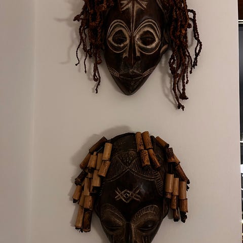 Masker - Rituel afrikansk halvmaske i udskåret træ med med hår af hamp