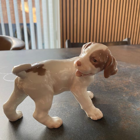 Royal Copenhagen figur af hund i porcelæn med brun og hvid farve. Figuren måler cirka 12 cm i højden. Den er dekoreret med detaljeret maling og har Royal Copenhagen mærkat på undersiden.