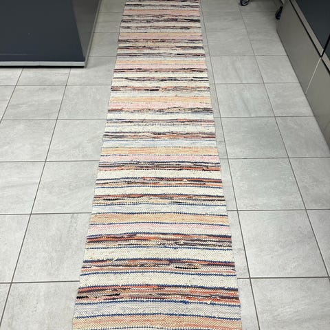 Charmerende håndvævet svensk kludetæppe i klassiske striber med varme og levende farver. Tæppet har et rustikt og hyggeligt udtryk, som passer perfekt til både entré, stue eller sommerhus. Fremstillet i slidstærkt materiale og med fine frynser i enderne. Et unikt tæppe med masser af sjæl og nordisk charme.