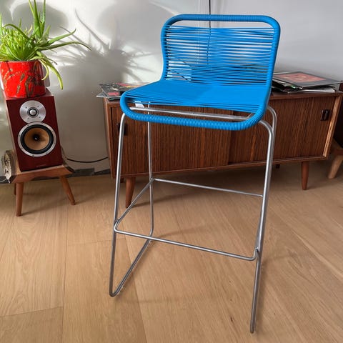 VP ONE barstole i med stel i rustfrit stål, sæde og ryg håndflettet med snore, forstærket med nylonkerne