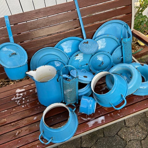 sæt bestående af flere forskellige dele med blå glasur. Sættet indeholder blandt andet kander, skåle, en rive og en si. Materialet er jern og farven er blå. Emailje Sættet kan anvendes til servering og madlavning.og pynt