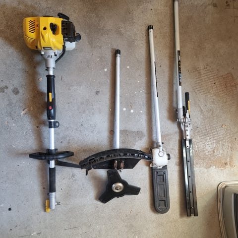 Texas BCU33M multiværktøj med tilbehør inklusive kædesav, hækkeklipper og trimmer. Udstyret med bæresystem og forskellige hoveder til havearbejde. Motoren er benzindrevet og designet til alsidig brug i haven.