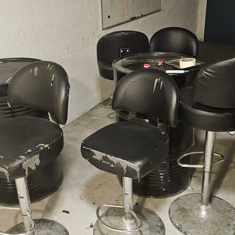4 stk. gamle barstole med metalstel og træsæder og -ryglæn.