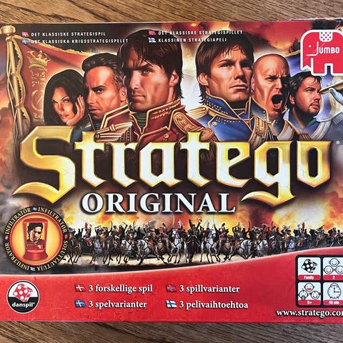 Stratego brætspil med klassisk design og illustrationer på æsken. Spillet involverer strategi og taktik for to spillere.