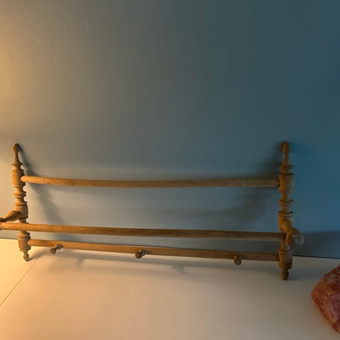 Retro, knagerække i teaktræ, rigtig flot stand, med træ kugler på knagerne. L: 89 cm, H 6 cm, med 4 teaktræs bøjler.