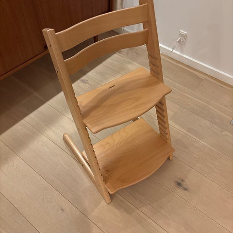 Stokke Højstol i træ. Børnestol designet til at give støtte og komfort under måltider. Fremstillet i træ med justerbare trin og sæde for tilpasning til barnets vækst.