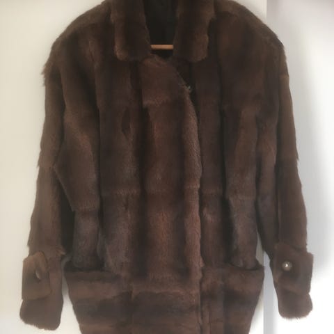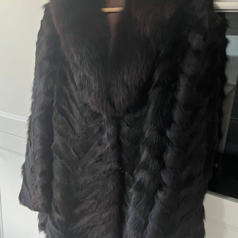 Vinterjakke i størrelse 40 til kvinder, farve brun. Jakken er fremstillet af minkpels, hvilket fremgår af mærket 'Saga Mink - Superb Quality'. Jakken er designet til vinterbrug og har en klassisk pasform. Meget lidt brugt.