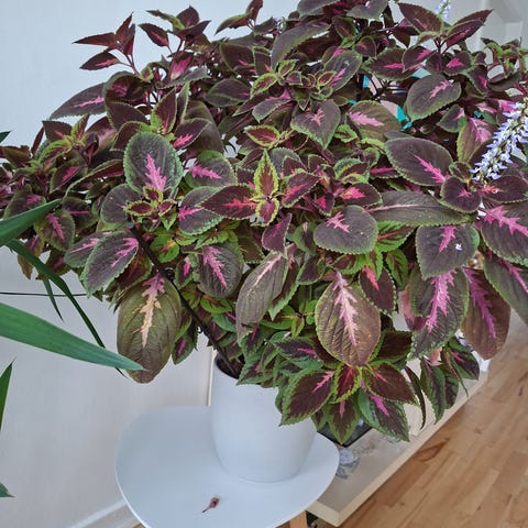 Coleus plante med karakteristiske lilla og grønne blade. Planten er velegnet til indendørs brug og kræver moderat lys og vanding. Den kan anvendes som dekorativ stueplante.