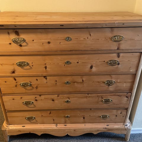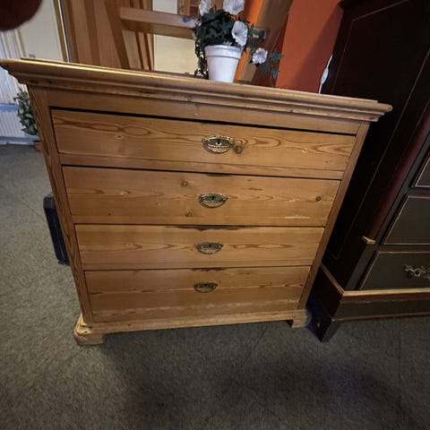 Stor flot afsyret kommode med flotte udskæringer. 3 skuffer med porcelænshåndtag. Dejlige store og dybe skuffer