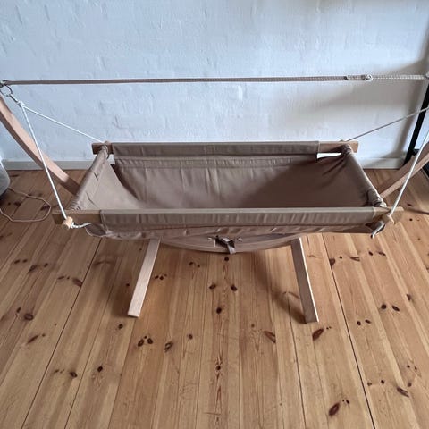 Babybjörn Vugge i hvid farve. Fremstillet med en kombination af stof og træmaterialer. Designet til at give en sikker og komfortabel soveplads til små børn.