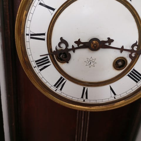 Vægur i træ med pendul og rund urskive med sorte tal på hvid baggrund. Uret har glaslåge med dekorative trædetaljer,
