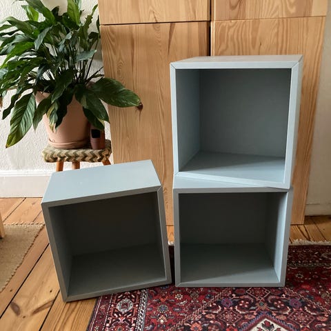 Tre bogkasser fra IKEA sælges. Har brugsspor, men er ikke i stykker. Skinner til ophængning medfølger. Sælges samlet for 150 kr.