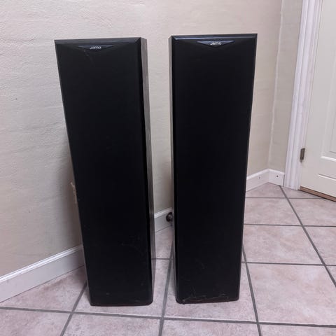 Jamo Classic 8 gulvhøjttalere i sort farve. Højtalerne har flere drivere, herunder bas- og mellemtoneelementer, og er designet til at levere lyd med en langvarig effekt. De har hver en impedans på 4 ohm og en maksimal effekt på 200 watt.