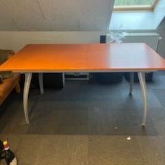 Smukt spisebord i kirsebær. L = 200 cm når det er trukket ud og L = 150 cm når skubbet ud, bredde 100 cm. højde 75 cm. Det smukke spisebord sælges for kun 750 kr. Tlf 40742594