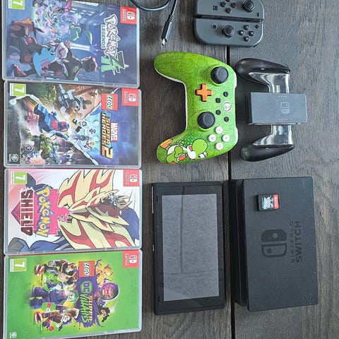 Nintendo Switch konsol med alt originalt tilbehør. Pokemon Legends Arceus spillet følger med i prisen. Konsollen kan både sættes til TV'et med den inkluderede dock, men kan også bruges i håndholdt tilstand og tages med på farten. Den er kun blevet brugt i docket tilstand herhjemme, og lider derfor ingen slid og skærmen har ingen ridser.