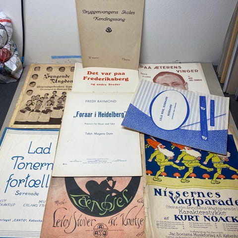 9 gamle danske nodehæfter: Kaalunds fabler. Toner fra den glade varieté. Med Jydepeter til liegstouw. Her er jeg, men hvor er du. Jomfru vil De med i Skoven. Helnæs-sangen. Du har en ven. 75 øres småsange. Frøken Nitiuche. Sælges samlet. Sender gerne men ikke via “fiks færdig”. Køber betaler porto.