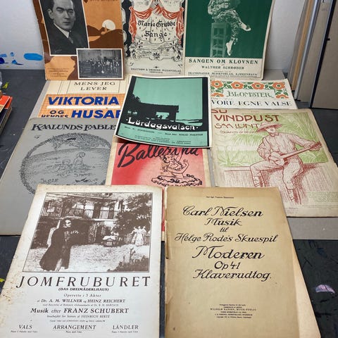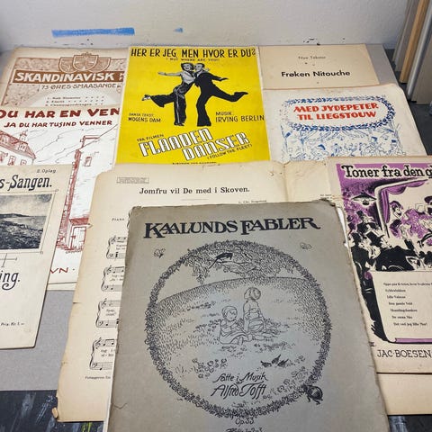 9 gamle danske nodehæfter: Nissernes Vagtparade. Forår i Heidelberg. Længsel. Lille Rose, Rosemarie. Lad tonerne fortælle. Det var på Frederiksberg. På æterens vinger. Bryggevangens Skoles Kendingssang. Syngende Ungdom, Wienersängerknabens Repertoire. Sælges samlet. Sender gerne men ikke via “fiks færdig”. Køber betaler porto.