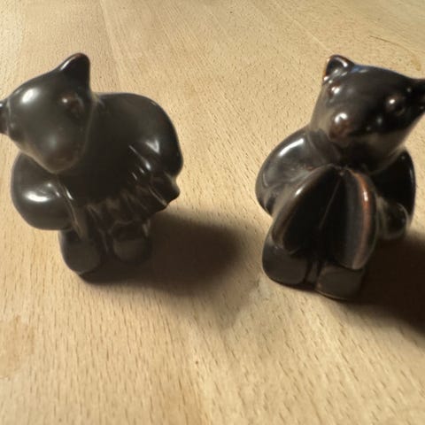 To Små siddende bjørne. Højde 4 cm. 100 kr. stykket.