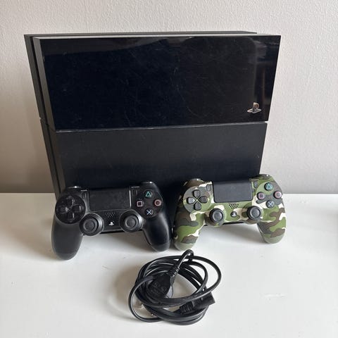 Sony PlayStation 4 konsol med to røde DualShock 4 trådløse controllere. Konsollen har HDMI-udgang og USB-porte. Controllere har standard knapopsætning og touchpad. Systemet er velegnet til hjemmeunderholdning og spil. Prisen kan sættes ned.
