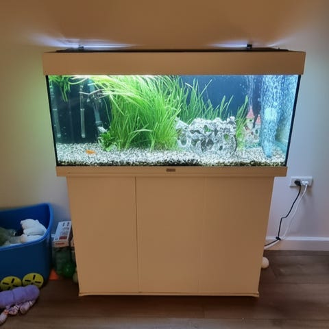 Komplet og klar til brug. LED-lys, filter, pumpe, varmelegeme, foderautomat og alt ekstra til vand medfølger. Alt fungerer :) skal hentes i Aarhus C.