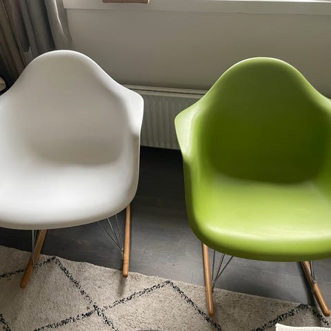gyngestol i hvid med armstøtter og ryglæn. Stolen er fremstillet i træ og designet til indendørs brug.