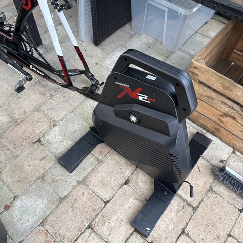 Power Trainer til cykeltræning indendørs. Udstyret med en robust ramme og avanceret modstandssystem for realistisk træningsoplevelse. incl. tandhjul og hjemmelavet holder i stedet for forhjul, så den er mere stabil og fylder ikke så meget