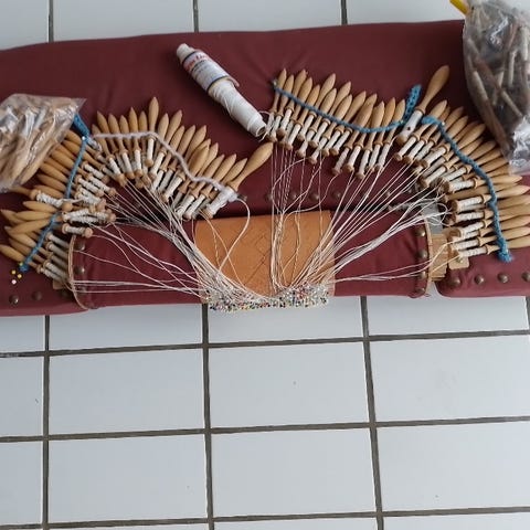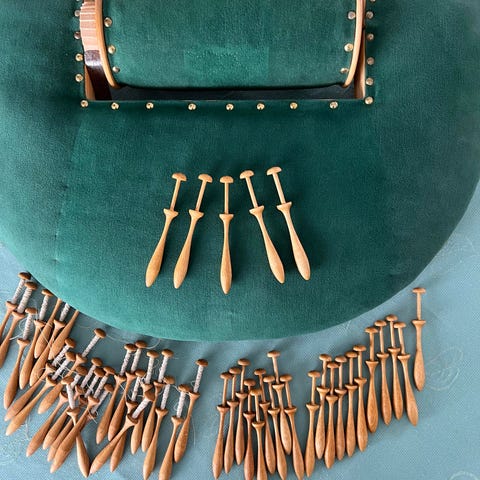 I alt 31 fine kniplepinde. Fremstillet i træ med forskellige detaljer og 9 kan dekoreres yderligere med perler.