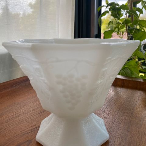 Den har et detaljeret, præget mønster på den forsølvede skål med drue ranker.