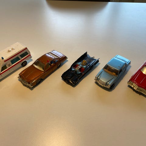 Samling bestående af fem legetøjsbiler og en legetøjsbåd.