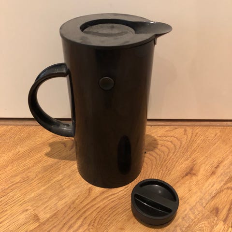 Stelton termokande i sort farve. Designet til at holde drikkevarer varme eller kolde i længere tid. Fremstillet i holdbart materiale med låg og håndtag for nem brug.