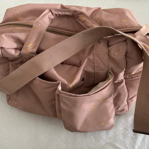 Fin pusletaske fra Konges Sløjd inkl. puslemåtte i blåblomstret mønster. Fin stand
