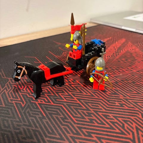 Klassisk LEGO/Legoland sæt 6022-1 med hest og vogn samt 2 minifigurer (ridder + armbrøstskytte) og tilbehør/flag som vist på billederne.