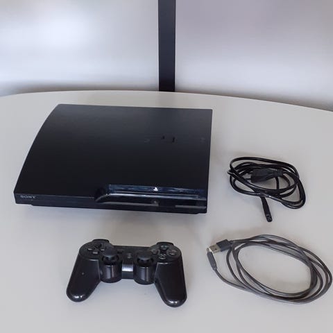 Sony PlayStation 3 spilkonsol med to controllere. Sort farve, standard størrelse. Konsollen er designet til hjemmeunderholdning og gaming.