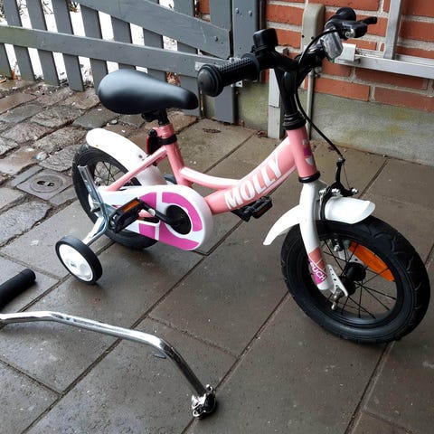 Kildemoes Bikerz 12" er et godt bud på den første cykel til den lille pige, der skal prøve kræfter med cyklingens ædle kunst. Med sine smarte farver og finedetaljer er den både sej og stilfuld. Cyklen er ideel til piger i alderen 2-3 år.Du får en dansk-designet cykel, der er bygget på et robust aluminiumsstel af høj kvalitet, hvilket sikrer lang holdbarhed. Støttehjulene, der er monteret på cyklen, kan nemt afmonteres, hvis det bliver nødvendigt.Med skærme på kranken og for- og baghjul undgår dit barn det værste vand og snavs fra vejen. Og med både fodbremse og v-bremse er det let at bremse hurtigt og sikkert.Her kan du finde den rigtige cykel størrelse til dit barn: Størrelsesguide