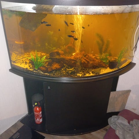 Hjørneakvarie 100L 83x53x50 med bord måle 121cm, pumpe, varmelegeme, grus, net og led lys alt til 1300kr mit nr 60 32 60 66