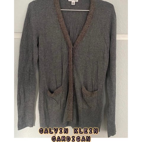 Calvin Klein Cardigan i sort farve, størrelse XL, lavet af uld. Cardiganen er designet til kvinder og har en åben front uden knapper eller lynlås. Materialet er uld, hvilket giver varme og komfort. Velegnet som et lag-på-lag stykke til køligere vejr. En del fnuller som sikkert kan fjernes