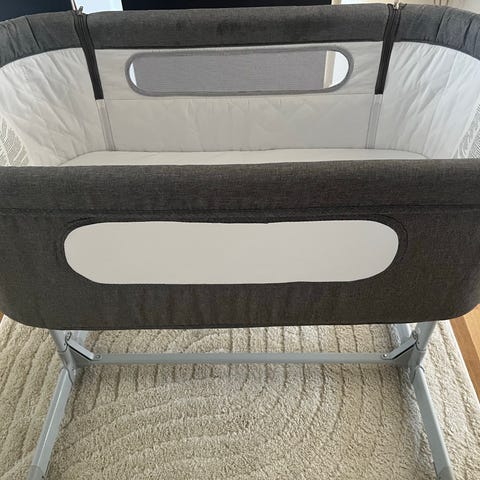 Babybay Bedside crib designet til at placeres ved siden af voksenes seng for nem adgang til barnet. Sengen har en grå og hvid farve og inkluderer en madras, der passer til bedside crib'en.