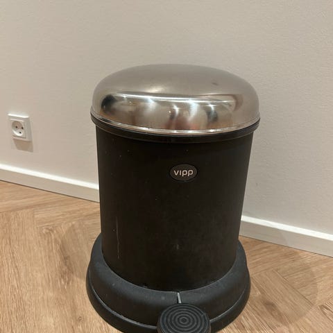 Vipp affaldsspand i beige farve med metal låg og indvendig spand. Designet til affaldshåndtering med fodpedal for nem åbning. Materiale inkluderer metal og plastikdele. Vipp model 15. Rummer 18 liter, højde 62 cm. diameter 23 cm. Der er ubetydelige brugsspor, men ingen buler, rust eller ridser.