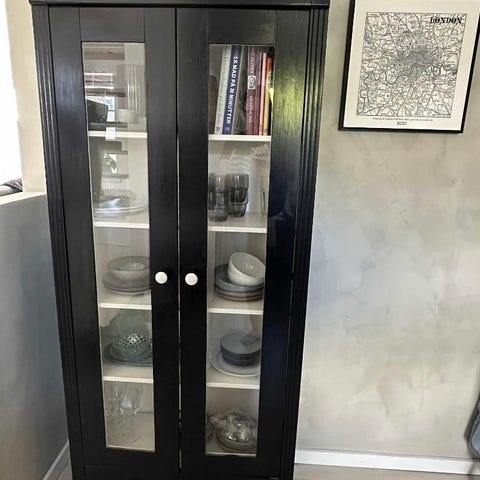 Fint afsyret vitrineskab med glaslåger. kan deles i to