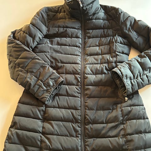 Covalliero dunjakke i størrelse S/36. Jakken er mørkeblå og har et quiltet mønster. Den har en høj krave og lynlås foran. Jakken er designet til kvinder.
