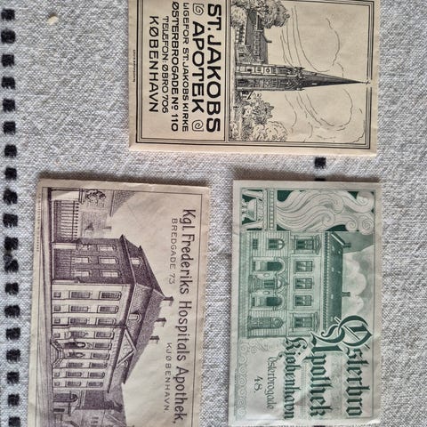 Gentofte Apothek receptkuverter med forskellige tryk. Pakkerne har historisk apoteksmotiv og indeholder håndskrevne recepter. Samlingen består af 5 kuverter.