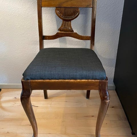 Måske 75-100 år gammel. HELT nybetrukket med nyt skum, pladevat og flot mørkegråt betræk. Meget let at ombetrække igen. Jeg gjorde det selv, hvilket kan ses på bagsiden af sædet.