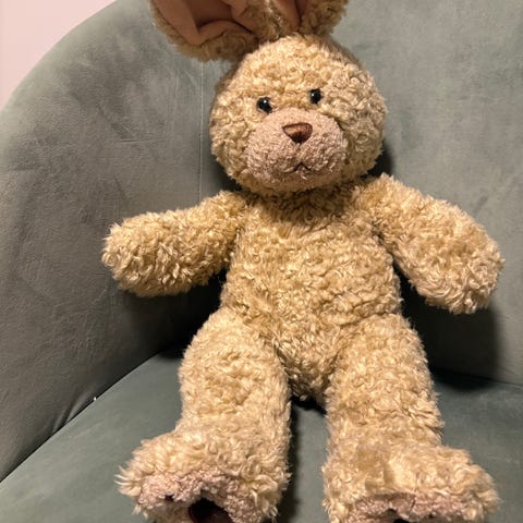 Build-A-Bear bamse i blødt, lyst brunt materiale med lilla hjerte på brystet. Bamsen har detaljer som broderede poter og er velegnet som legetøj til børn.