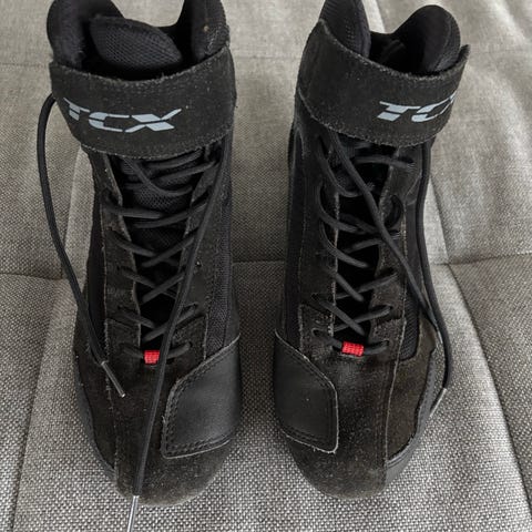 Støvlerne er brugte, og har lettere skrammer, der dog kan poleres op med læderfedt og skosværte. Er kun brugt til kørsel 1500 km, da jeg mistede interessen for MC