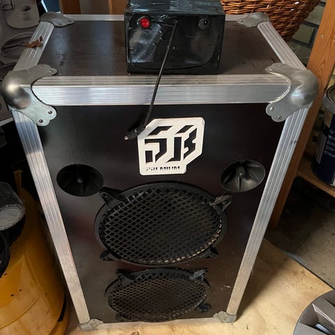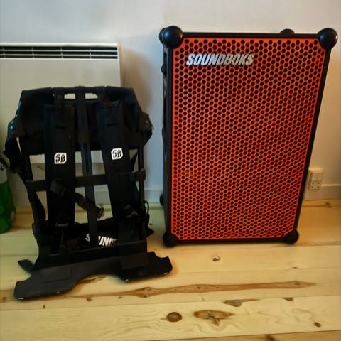 Meget velholdt SOUNDBOKS 3 der kun har været brugt sparsomt - maks spillet 50 timer på terrassen om sommeren. Der er en ekstra blå metalfront med der aldrig har været brugt samt org. Rygsæk samt 230V oplader.