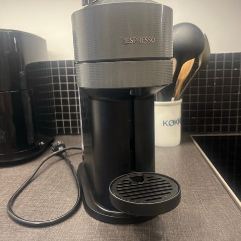 Nespresso kapselkaffemaskine i hvid og sort. Designet til brug med Nespresso-kapsler Vertuo.Kompakt størrelse, velegnet til hjemmebrug eller kontor. Let betjening med knapper på toppen. Alt godt men får den ikke brugt da jeg bor alt for tæt på byens bedste kaffebar ;-)