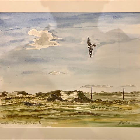 Original akvarel fra august 2002. Titel: "Traner". Mål (billedet): ca. 30x40 cm. Er monteret i alu-ramme med passepartout, mål: 40x50 cm.