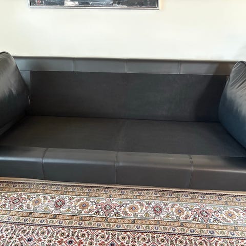 Skalma lædersofaer i sort, fin stand uden ridser. 2 pers. 200 cm. 3 pers. 230 cm bred. Ryghøjde 76cm. Siddehøjde 40 cm. Koldskumshynder som er formstabile.